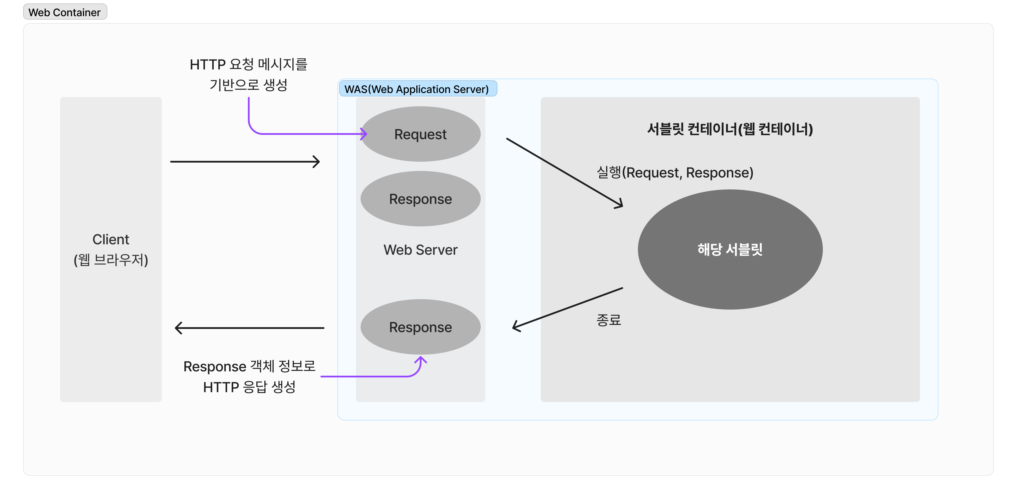 - 컨테이너는 이를 서버에게 전달한다. 서버는 reponse을 클라이언트에게 전달한다.